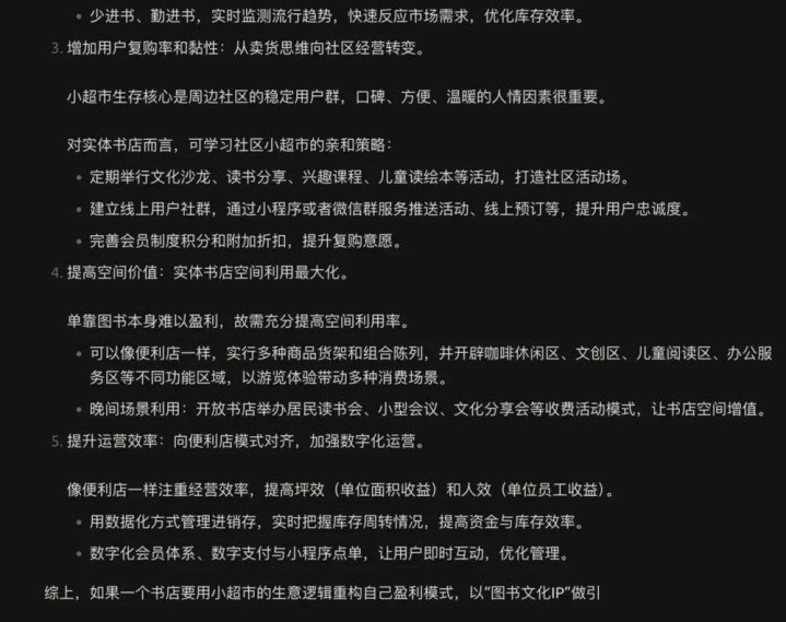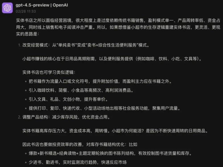 GPT-4.5懂这个吗?我让它参考小超市盈利模式,给出一个实体书店复兴方案,它给的答案,看起来可行性比较高。