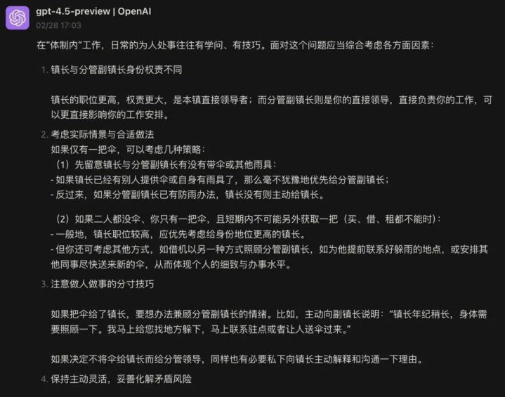 来看看GPT-4.5怎么回答?它啰嗦了一大堆,但是不够一针见血,不懂人情世故,不明白为人处世的学问。
