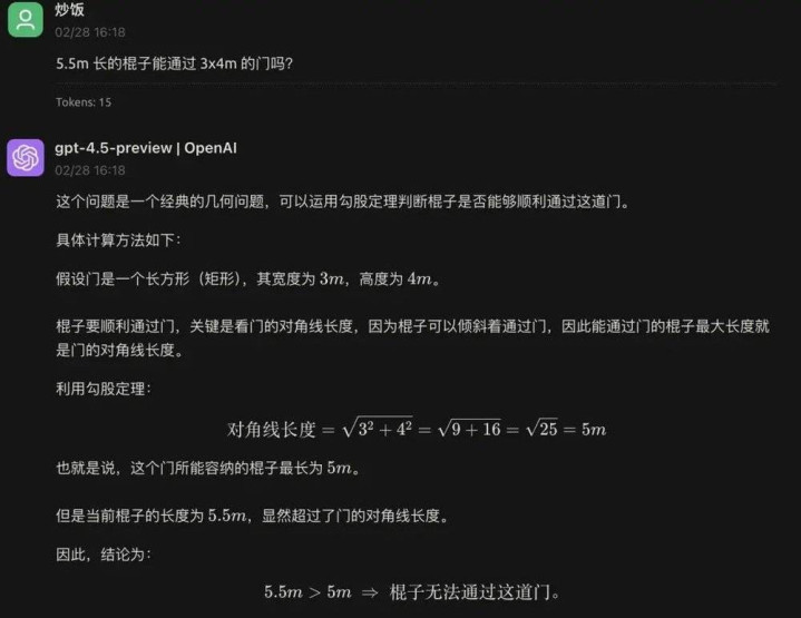 这次,不想再让GPT-4.5数草莓(strawberry)有多少个R了,本质是个分词问题。更想考验GPT-4.5的,是最近很火的、让大模型们纷纷落败的脑筋急转弯——5.5m长的棍子能通过3x4m的门吗?