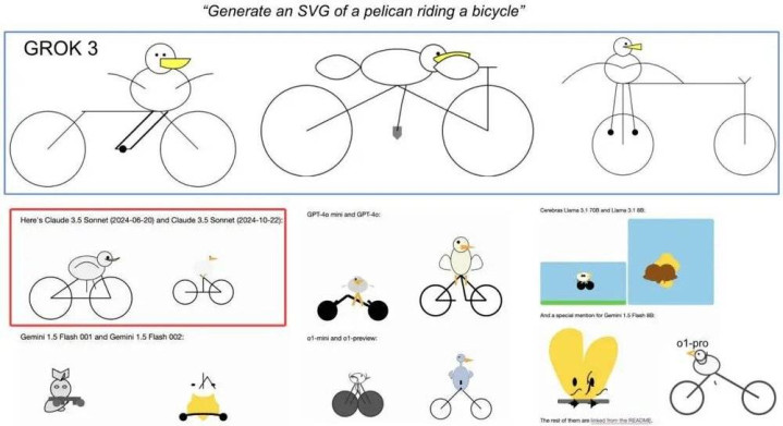 看腻了常规的数学题、代码题,测试大模型的能力,还有一个非常有趣的测试题——生成一张鹈鹕骑自行车的SVG。