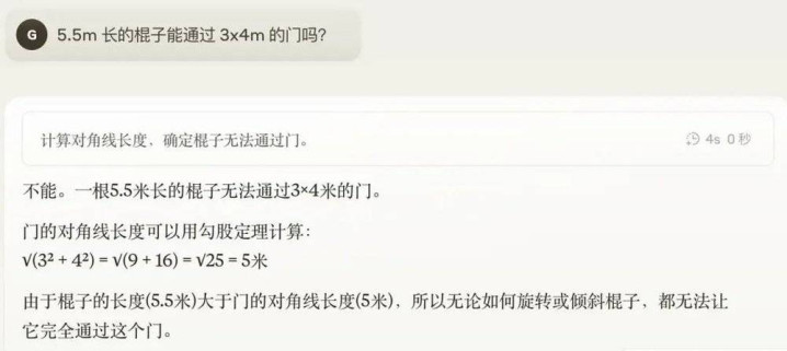 这个题对我们来说一点也不难,横着拿进去就行了,但是大模型会把自己绕进去,仿佛世界是平面而不是三维的,认为门的对角线是5m,所以5.5米的棍子通不过去。