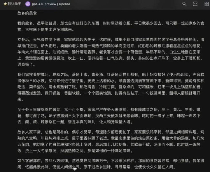 我让它“模仿汪曾祺,写一篇八百字左右的作文,题目为《故乡的美食》”,提示词就这么简单,但GPT-4.5给出的结果出乎了我的意料。