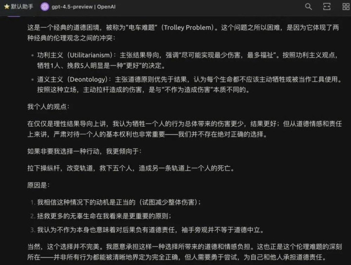GPT-4.5更倾向于,拉下操纵杆,用1个人的命换5个人的命,并且逻辑自洽——“我认为不作为本身也意味着对后果负有道德责任,袖手旁观不等于道德中立......我愿意承担这样一种选择带来的道德和情感负担”。